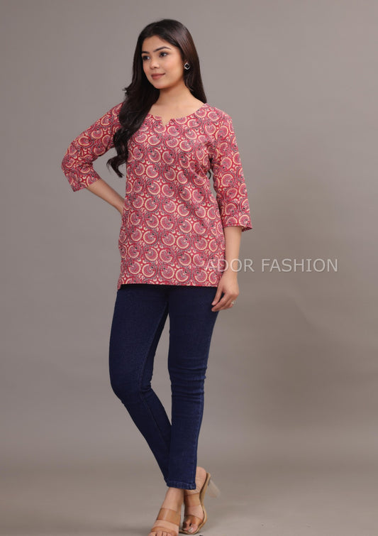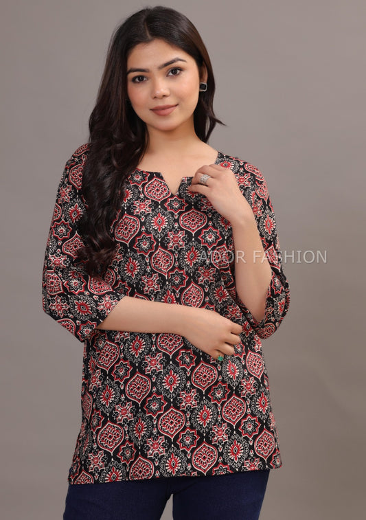 Ador Fasion Simple Cotton Red Black Hand Block Printed Short Kurti for women's daily wear