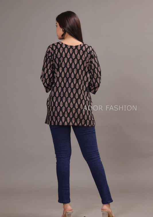 Ador Fasion Simple Cotton Red Black Leaf Hand Block Printed Short Kurti
