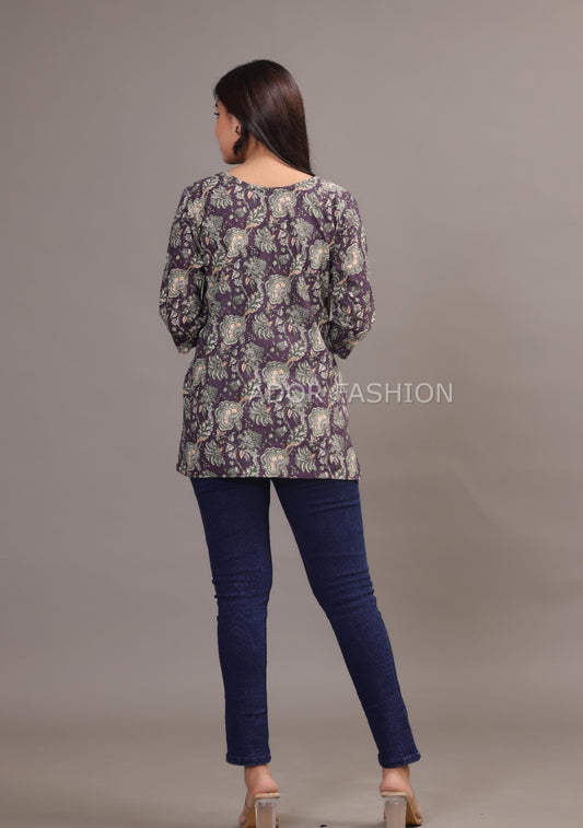 Ador Fashion Simple Cotton Floral Purple Hand Block Printed Short Kurti, Women's daily wear Kurti